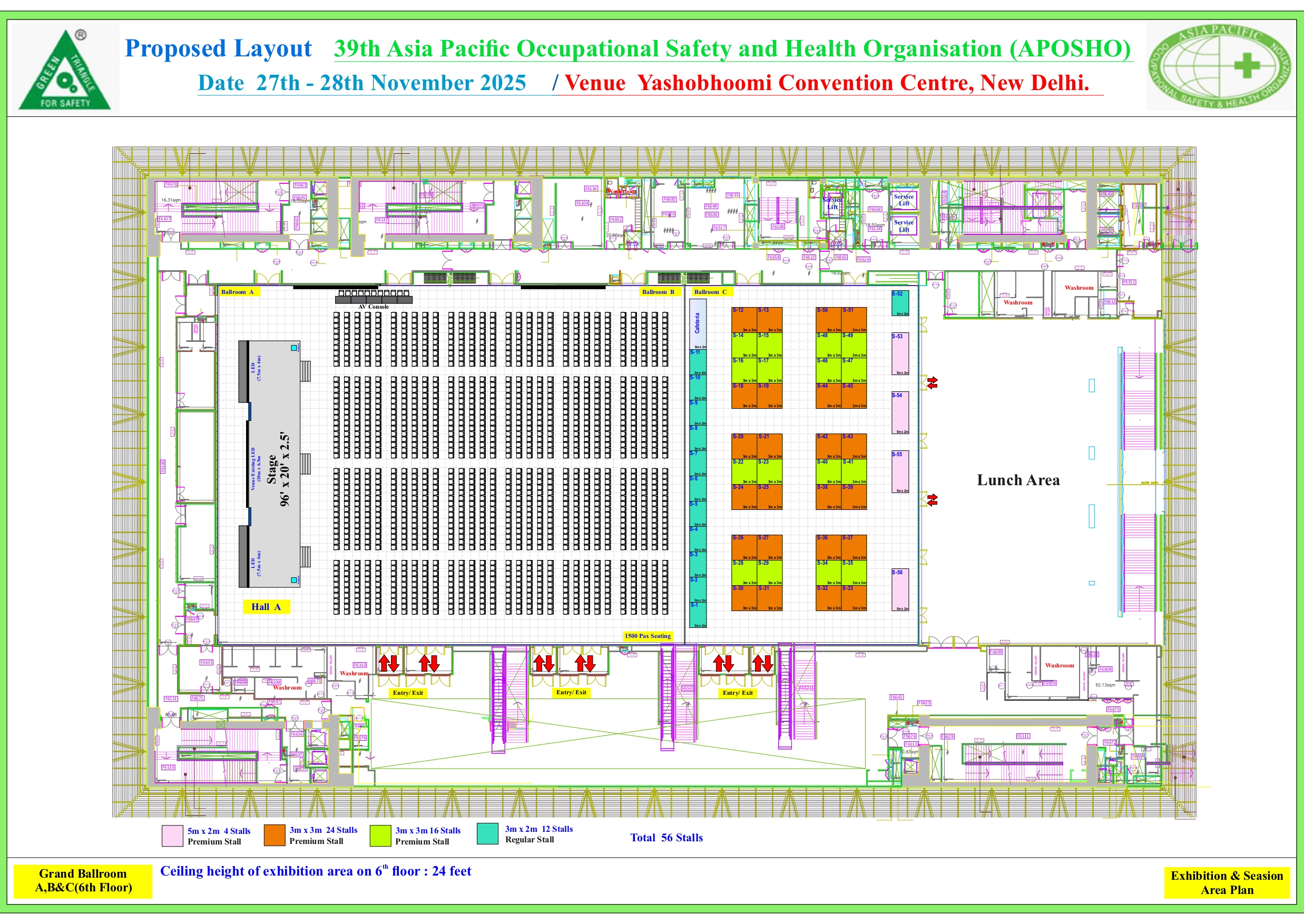 Stall amenities: Modular Stall built with prefabricated panels on 3 sides and shall be self-supporting with 1 table, 2 chairs, 3 spotlights, 15-amp socket, fascia plate with company name written in vinyl cut out letter, 3 sided white panels, 1 waste paper dustbin. The halls height on the 6th and 5th floors are 24 feet and 8 feet respectively. Premium Stalls are available only for Sponsors . The stalls will be booked first-cum-first served basis. Please contact for more details at aposho39@nsc.org.in